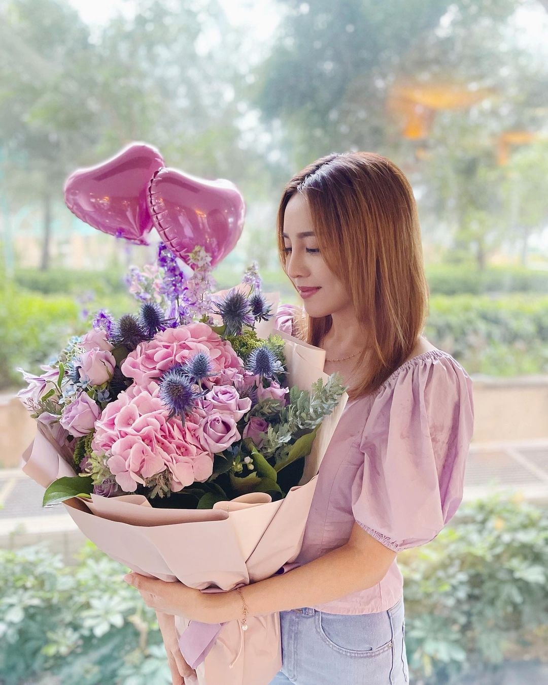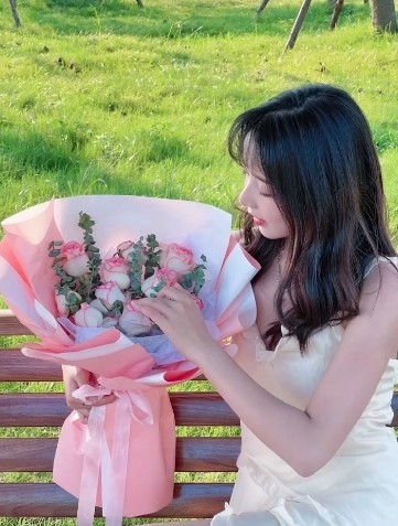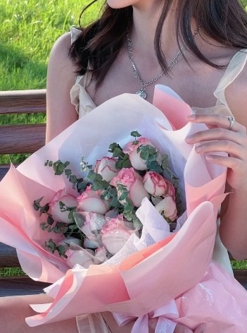 有些人不習慣拿著花束拍照,會直接用花束遮住自己的臉,但其實可以單手捧花,另一隻手就輕輕遮住嘴巴笑。或者可以將花束捧在胸前,再放大拍花束的細節。