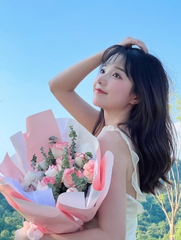 除此之外,又可以將手機放低仰拍,用藍天白雲來做背景,一隻手捧著花束,另一隻手就可以輕輕假裝撥頭髮,拍出來的效果自然又不做作。