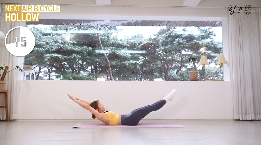 第一個動作先平躺在地下,然後同時舉起雙手及雙腳並離地,中間可以用雙手抱大腿稍作休息。