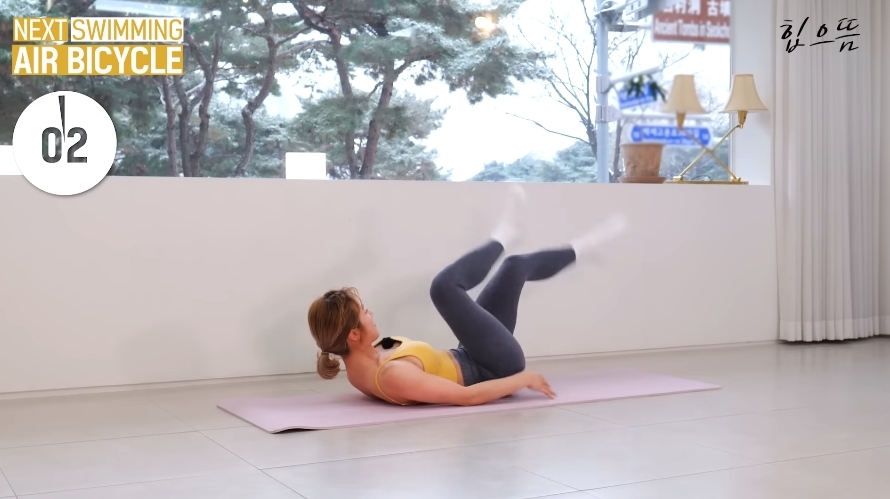 第二個動作是踩空中單車,不過注意上半身要抬起,雙腳在擺動的時候腹部要用力收腹。