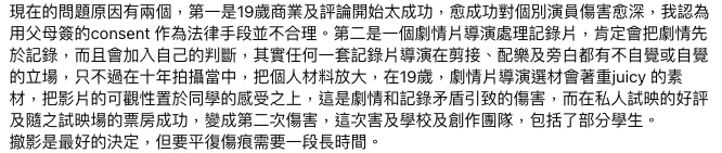 她提到參演的學生早在2011年已經簽好同意書,之後阿聆的家人都有參加放映活動,阿聆同意接受電影在包場或電影節播放,再加上看過電影的觀眾評語大多都很正面,所以她在阿聆未有簽第二份同意書的情況下,所以就決定將電影公映,她承認當中的理解有出入,甚至以為阿聆在過了6、7個月後心情已經平復。