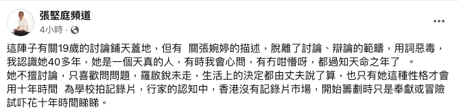 《給十九歲的我》引發風波,導演張婉婷被不少人指責沒有尊重片中的女學生們。近日陶傑與張堅庭都發聲評論事件,陶傑更力撐張婉婷沒有責任,是因為學生父母簽了「賣身契」?張堅庭則指好友張婉婷過於天真?