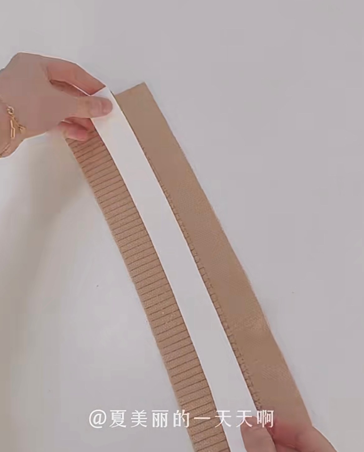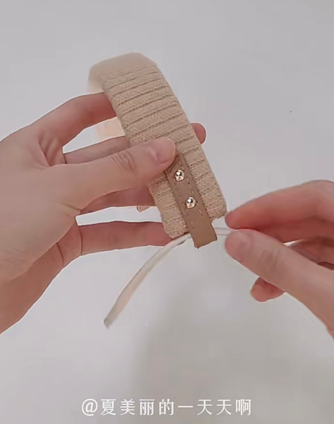 找一條皮帶,剪出兩段約6.5厘米的長條,縫合固定在手袋的兩側。中間可以留一小段開口用來穿肩帶。