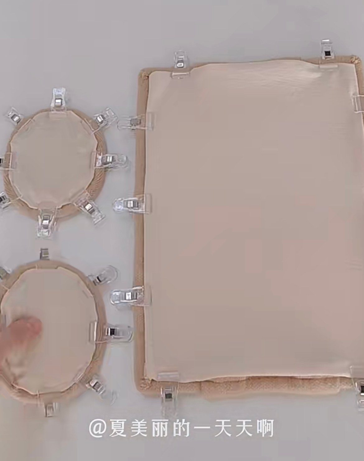 剪出跟毛氈布差不多大小的布料,邊緣往內折一點,然後縫合固定。
