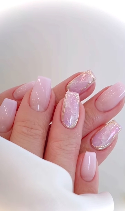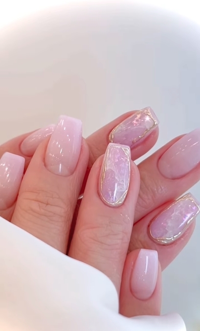 紫色一向都有顯白效果,所以換上淺紫色的美甲會給人感覺很清新,而且氣質滿滿。在其中兩隻美甲中特別添加金屬邊,還會額外增添奢華感,突出視覺效果之餘,更具個人特色!