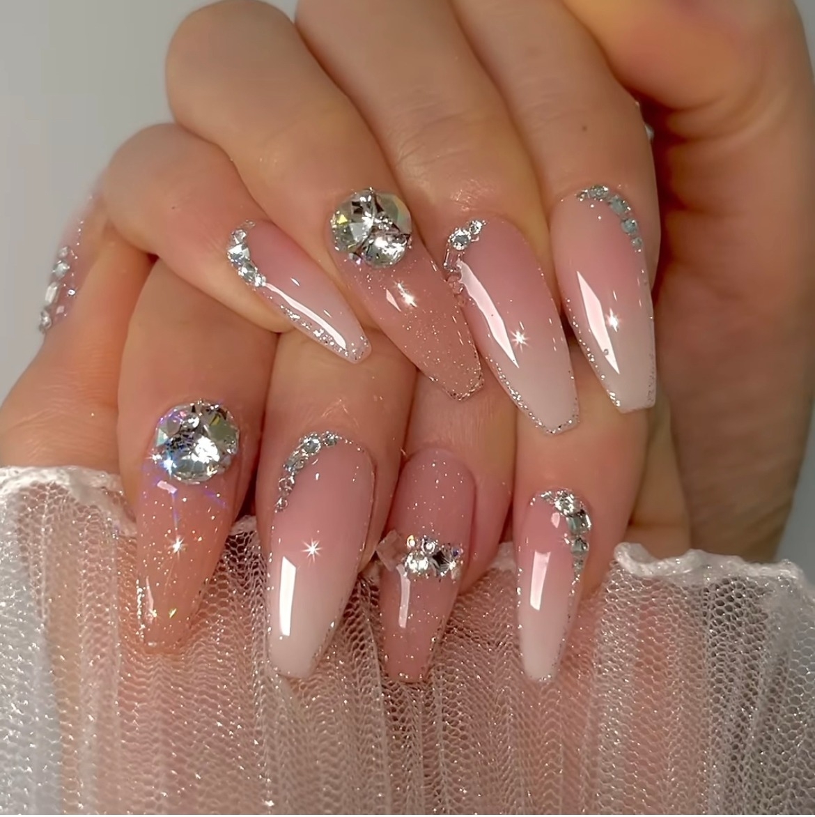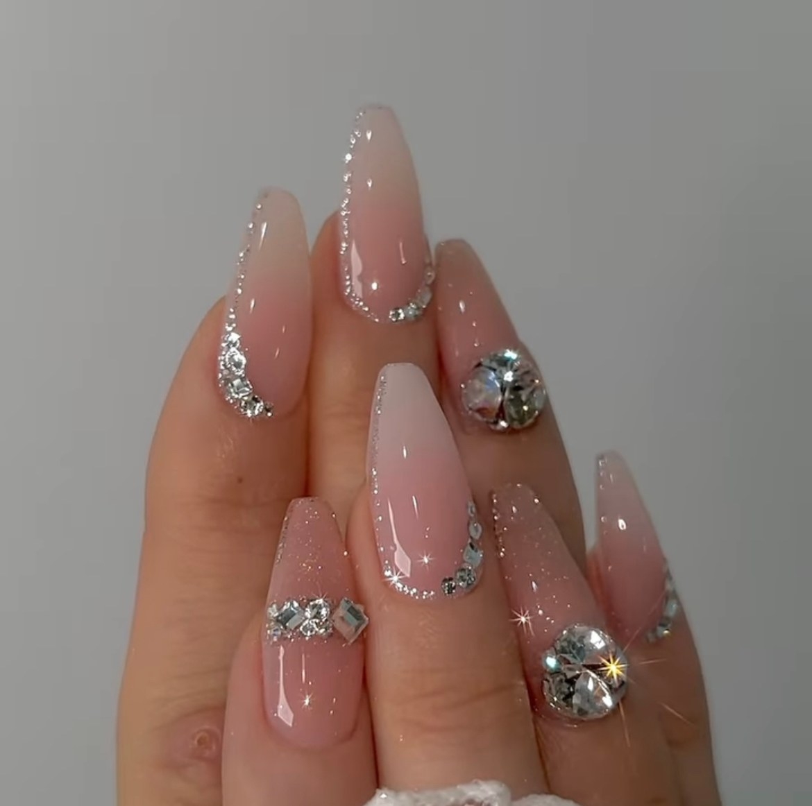如果喜歡比較招搖的款式,不妨選擇比較長型的美甲,會看起來比較有存在感!再配搭多個閃耀的大鑽石令人炫目,絕對會讓你看起來高級又閃亮,真的很難不喜歡啊!