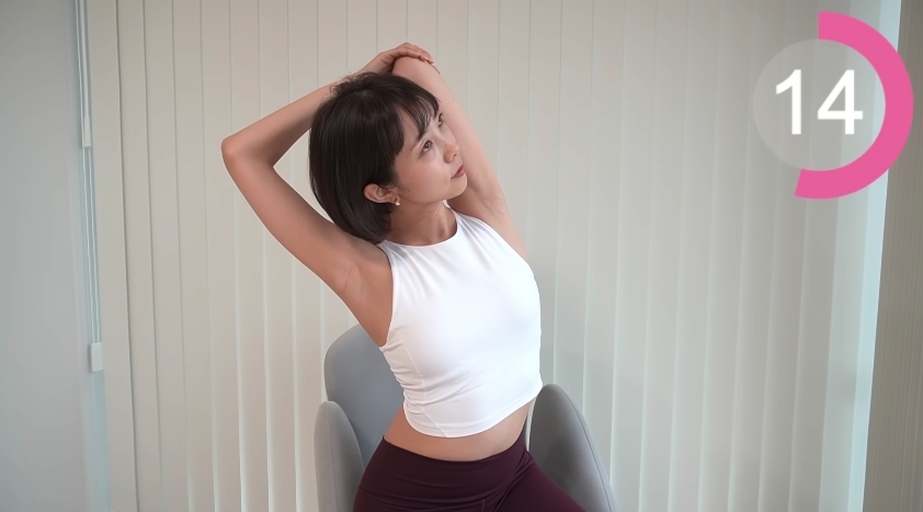Yuuka教導的第一個動作是雙手曲肘向後伸展30秒,注意在做動作是要盡量坐直,雙手向後伸展時會拉動到背部肌肉,而且明顯感受到膊頭的伸展。