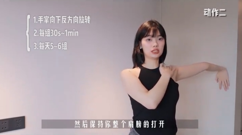 第二個動作可以令到肩膀打開,首先將五指張開並將手掌貼於牆面上,之後向下反方向旋轉,旋轉至手心朝上,再將肩膀向下壓,將另一隻手放在身後,會感受到肩頸與後背的拉緊,記得不能縮起肩膀。博主提到這個動作有效訓練到肩胛骨肌肉,改善到圓肩厚背問題。這個動作做30秒至1分鐘,每天做5至6組就可以。