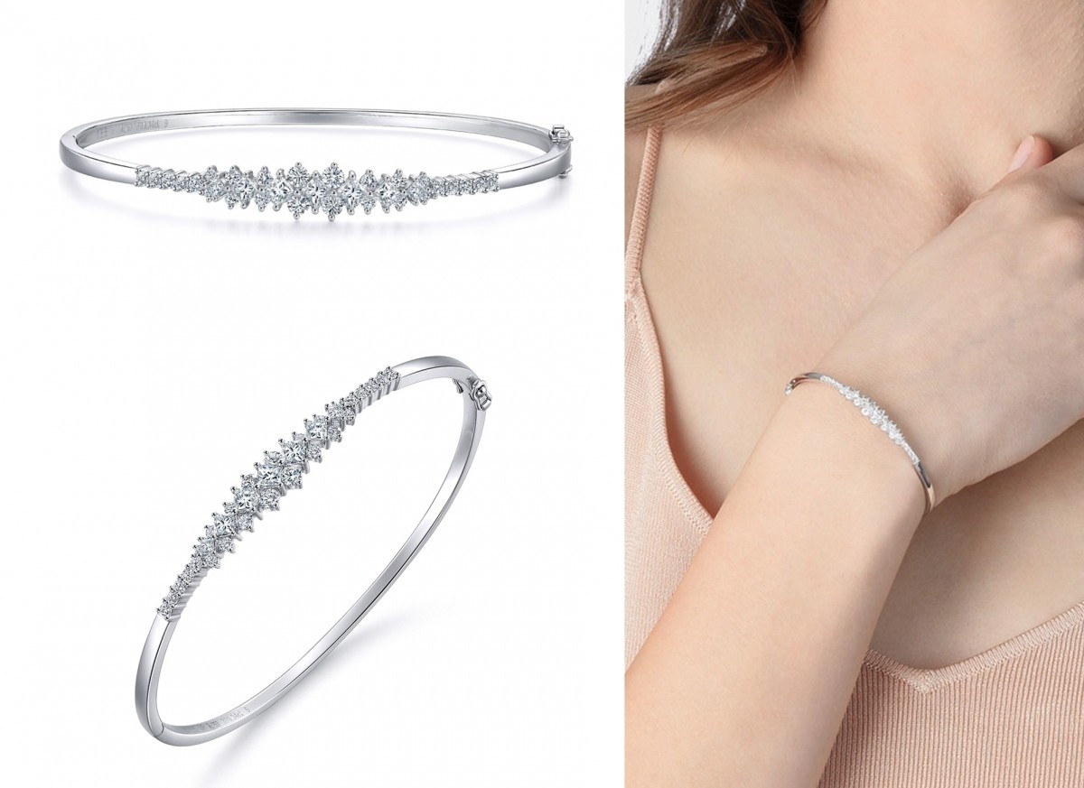 以18K白色黃金製成,簡約的一字型美鑽排列,上面鑲嵌了G-H級的鑽石,分別以圓鑽形及方形公主式的切工呈現,搭配中間華麗的花邊,戴上手耀眼且高貴~