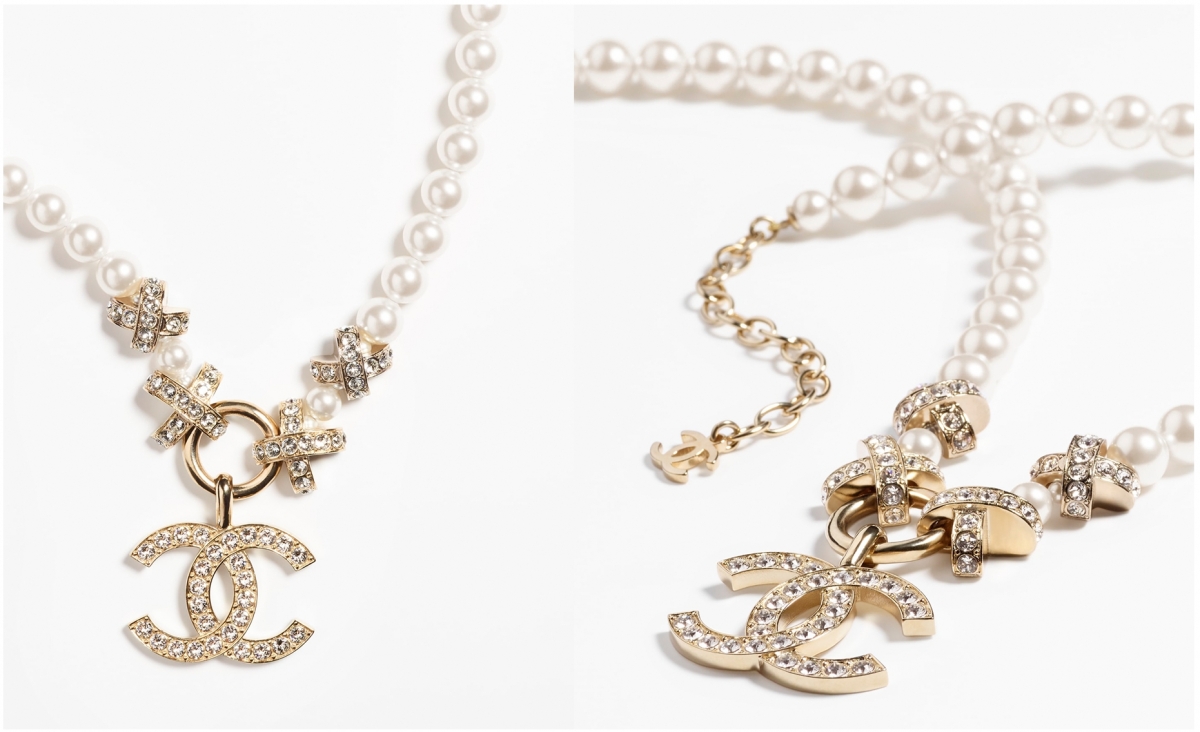 這款以金屬和玻璃珍珠組合而成,除了有4顆「X」型水鑽金屬裝飾,中間亦有一個雙C Logo 吊墜,上面鑲嵌著閃耀的水鑽點綴,頸鍊尾端亦有一個小小的雙C Logo,優雅又有質感~穿著純白的婚紗,很適合有一條搶眼的頸鍊來增加看點!