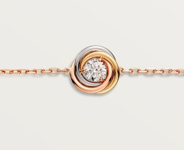 將卡地亞經典的Trinity三個環圈交織的設計融入手鐲,環圈中間鑲嵌了1顆重0.18克拉的明亮式切割圓鑽鑽石,獨特又優雅典範的風格,值得入手一條!一共有3色可選擇:18K白色黃金、18K黃金及18K玫瑰金。