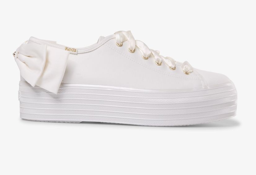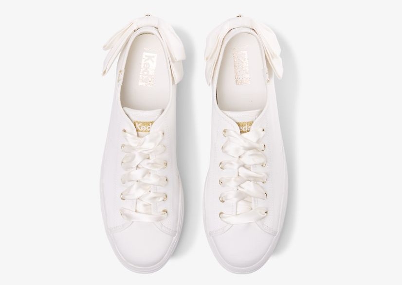 Keds是其中一個大熱小白鞋牌子,也有出婚鞋系列,而且有多種款式可選擇,用它來搭配白婚紗同樣優雅且得體!這款就以平底的運動鞋設計,加上1.5英寸的增高鞋底,相對較舒服和顯高,在鞋跟位綁有一個奶白色絲帶的蝴蝶結,鞋帶同樣是絲帶配上金色孔眼,超有氣質~