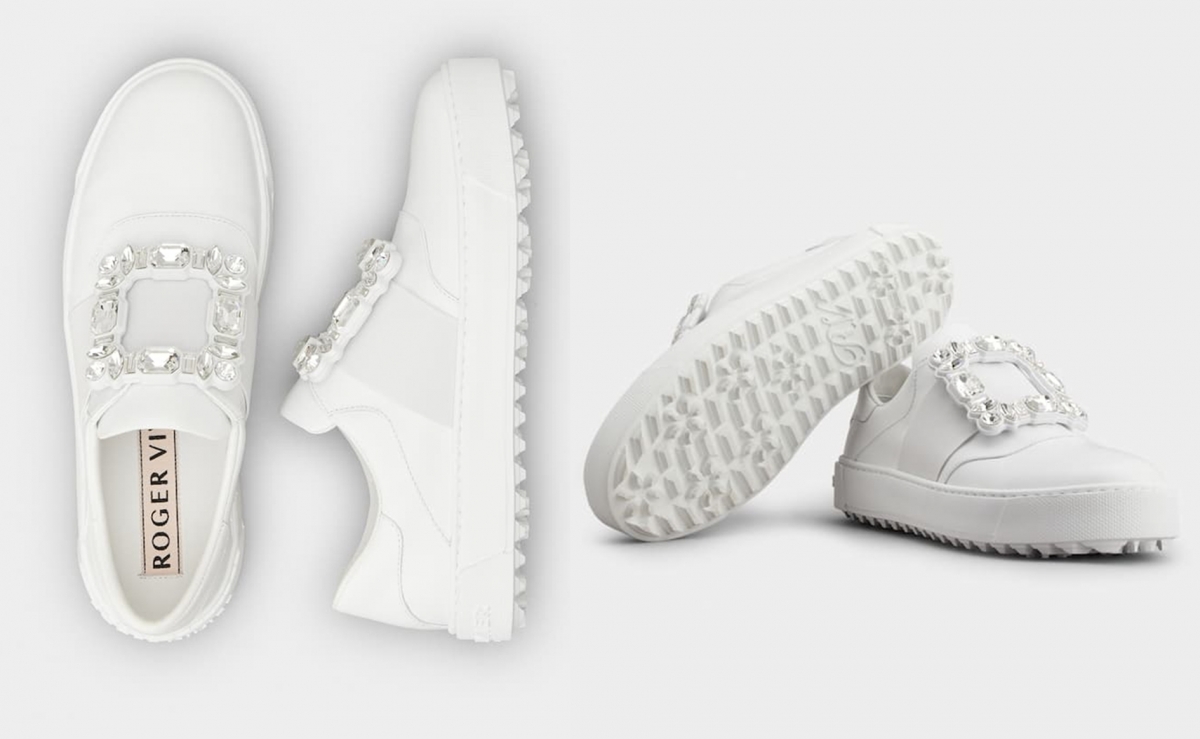 Roger Vivier 是新娘大愛的夢幻婚鞋品牌之一!除了高踭鞋外,運動鞋系列單品也是十分精緻,糅合休閒街頭風和高訂風格,厚底設計能修飾腿型,顯高效果一樣很好,讓混搭俐落又顯氣質! 新款的Viv' Golf鑽扣皮革運動鞋,以柔軟皮革製成,彈力帶設計再加有閃鑽飾扣作點綴,搶眼又不失高貴感!鞋底更是加入了花型圖案,十分可愛!