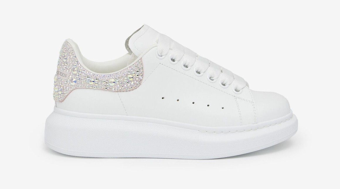 McQueen的厚底運動鞋也很受歡迎,採用白色小牛皮,淡淡的粉紅後跟位鑲嵌了閃亮且夢幻的陶瓷水晶,提升貴氣感~鞋舌位置也飾有Alexander McQueen標誌,而鞋底是橡膠厚底,不但會有標誌性的壓印設計,厚底更是有助拉長比例,顯高顯瘦!日常穿也不算太浮誇~
