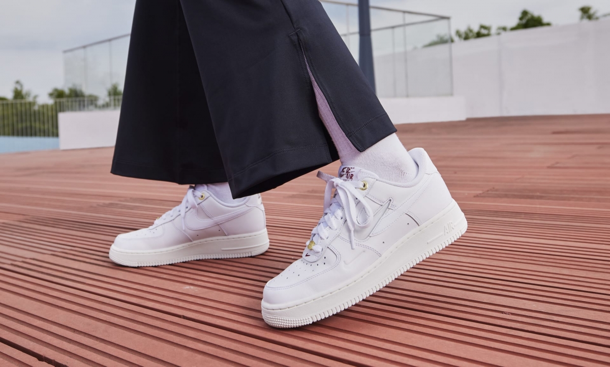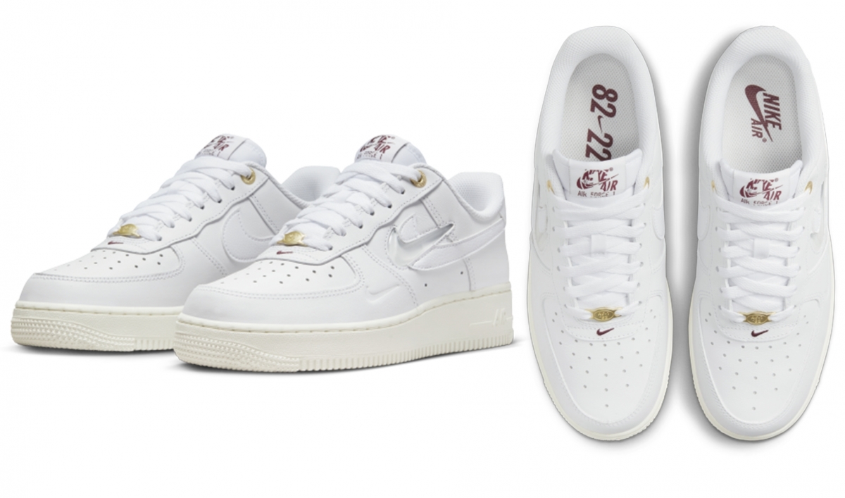 大熱AF1除了淨白色,也可以考慮一些特別款,同樣舒適又百搭!像這款AF1就加入了不少大熱設計元素,最頂的鞋眼和鞋帶釦都是以金色為主,標誌性的Nike Swoosh Logo也加入了一個迷你閃耀 Swoosh在旁邊,更添特色!鞋舌標籤融入過往 AF1 標誌,並配上酒紅色,十分好看!