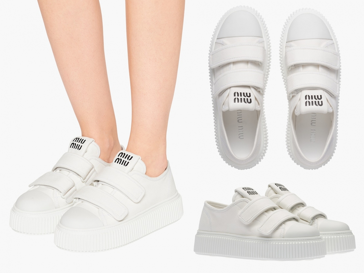 簡單地以白色牛仔布製成的運動鞋,加上橡膠鞋頭令鞋型帶點圓潤柔和的線條,並採用魔術貼搭帶開合,鞋舌上亦印有黑色的「Miu Miu」Logo,百搭易襯,展現出可愛又少女感的一面~
