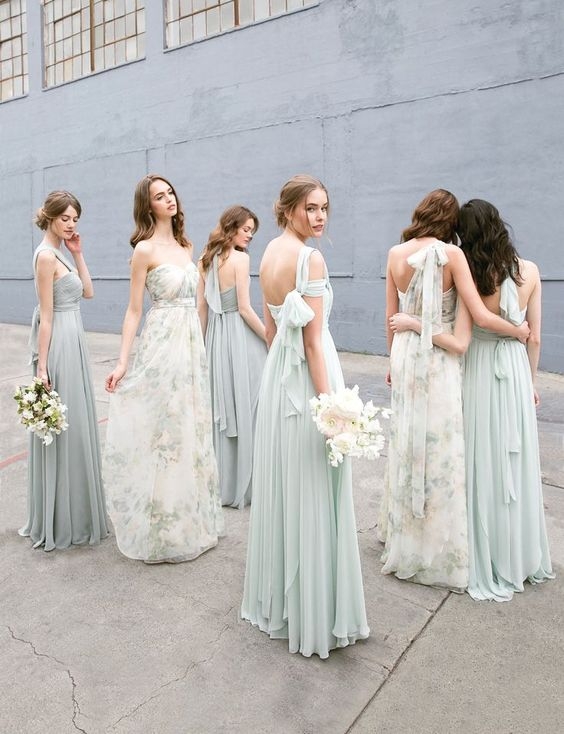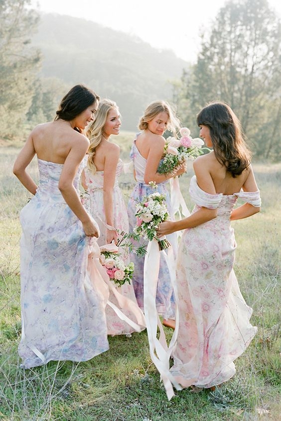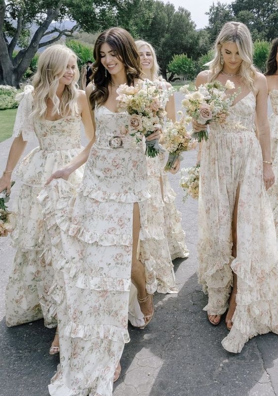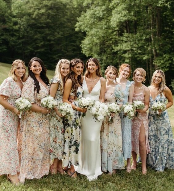 除了純色的姊妹裙,不妨也嘗試夢幻又甜美的碎花款式,非常適合甜蜜、溫馨的婚禮。而帶印花圖案的款式,低調又不失女人味~不過也要小心挑選印花的圖案,太小碎花會相對比較老土,較大的印花則更顯大方得體!加上雪紡質地還會帶點飄逸感,超仙!