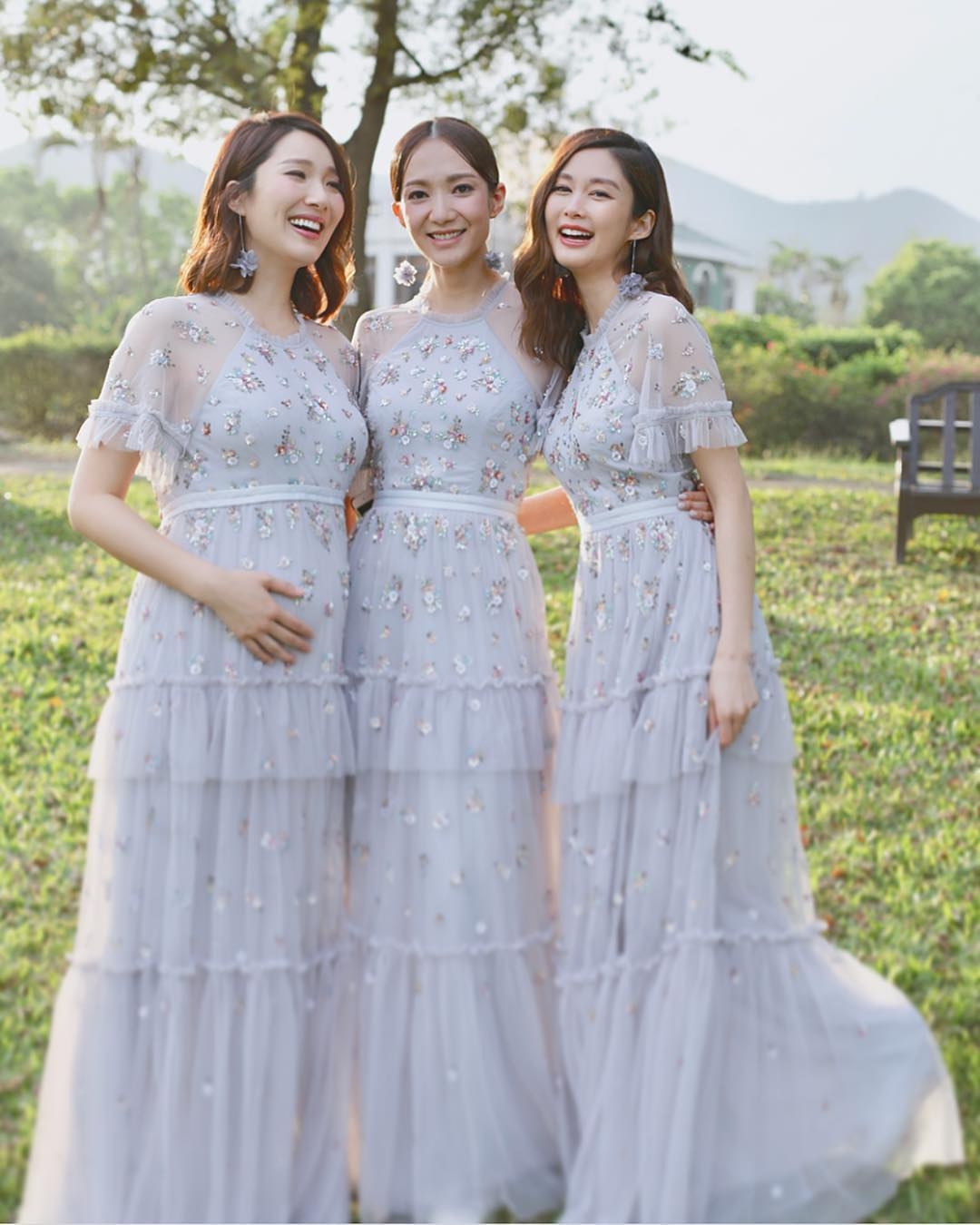 當年苟芸慧結婚的日子,一班超靚姊妹團正正就是身穿淡淡的灰藍色薄紗裙,上面帶有彩色的釘花串珠作點綴,加上小透膚的牛角設計,精緻又不失性感~
