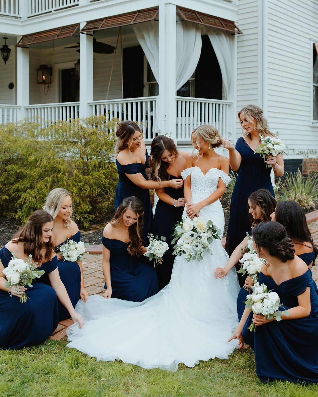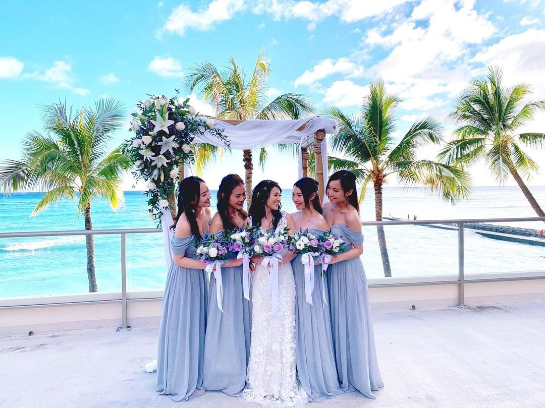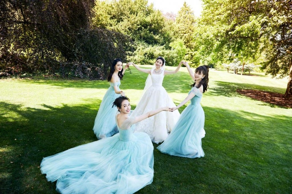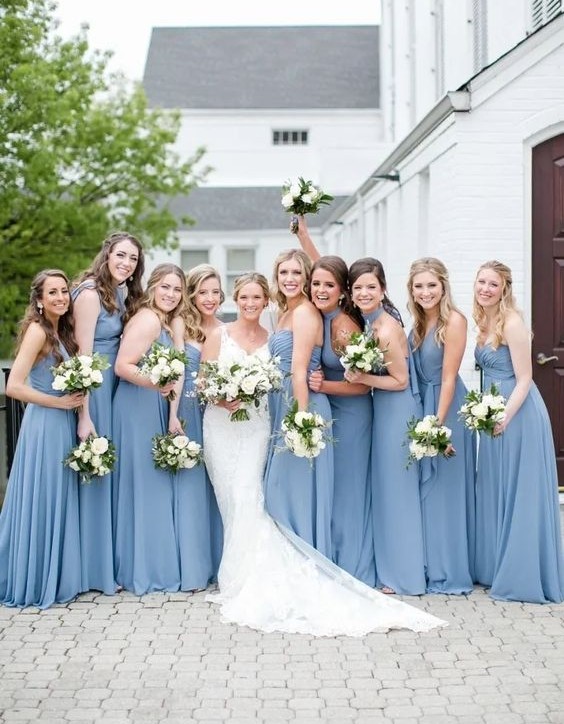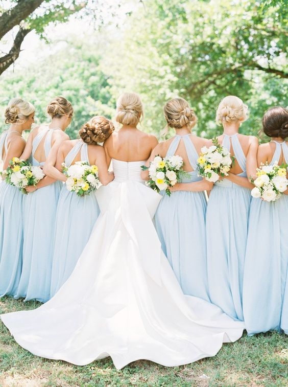 天藍色同樣是熱門姊妹裙的色調,看上去淡雅又清爽,而且十分適合室外婚禮,與藍天白雲互相襯托之下更添活力感,給人帶來愉悅的心情~像張若昀和唐藝昕的婚禮上,豪華的伴娘團就是身穿天藍色姊妹裙~