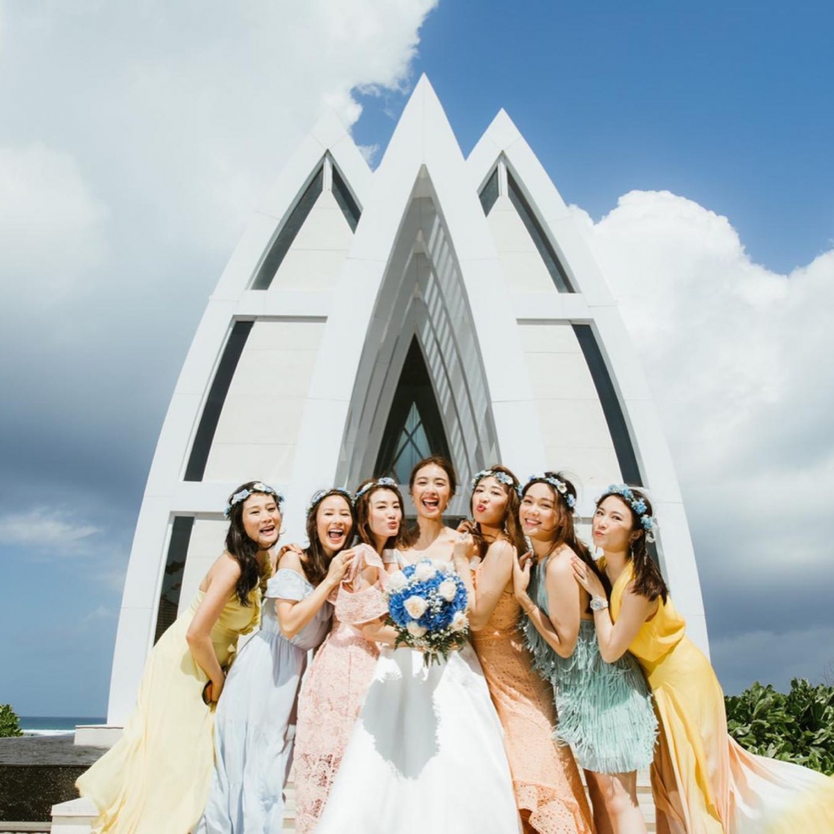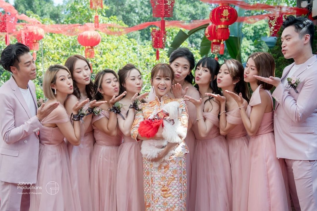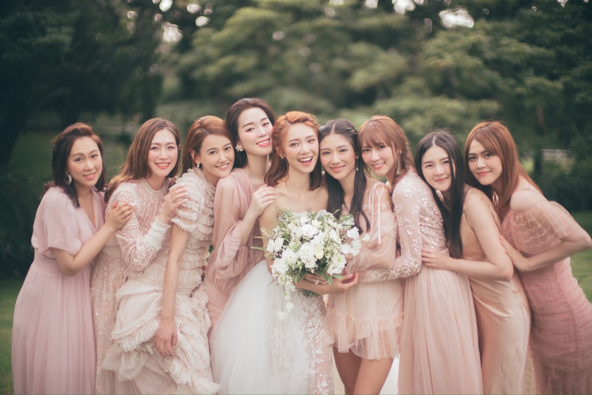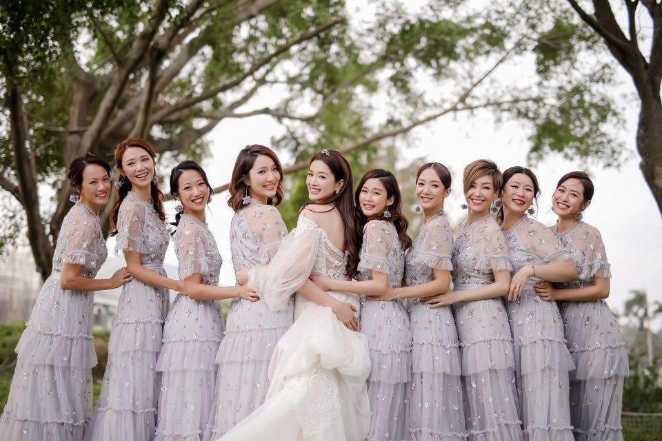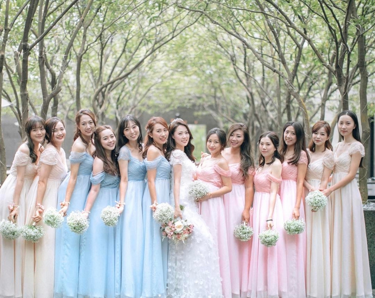 其實姊妹團不一定是穿著同色、同款的裙裝才算是統一及得體,每人一色看上去歡樂感大增!但記得盡量以淡雅色調為主,相對比較和諧又不會太雜亂。朱千雪結婚時的星級姊妹團正正就選擇了彩虹色調的姊妹服裝,每位都超靚又有個性!