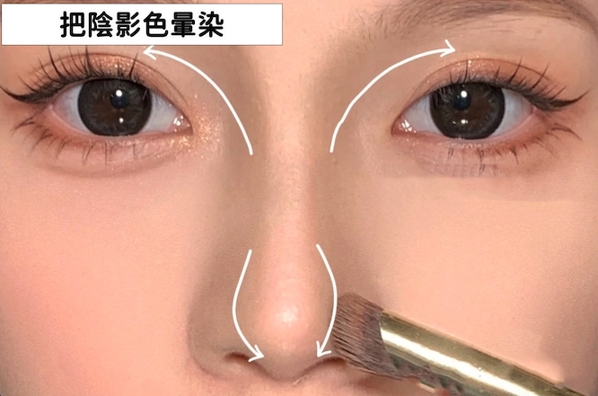 然後利用小刷子去暈染修容的部分,注意控制陰影的範圍,鼻子盡量暈染得窄一點。