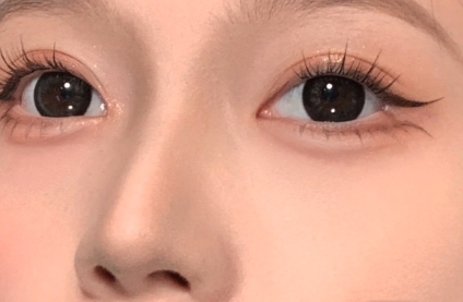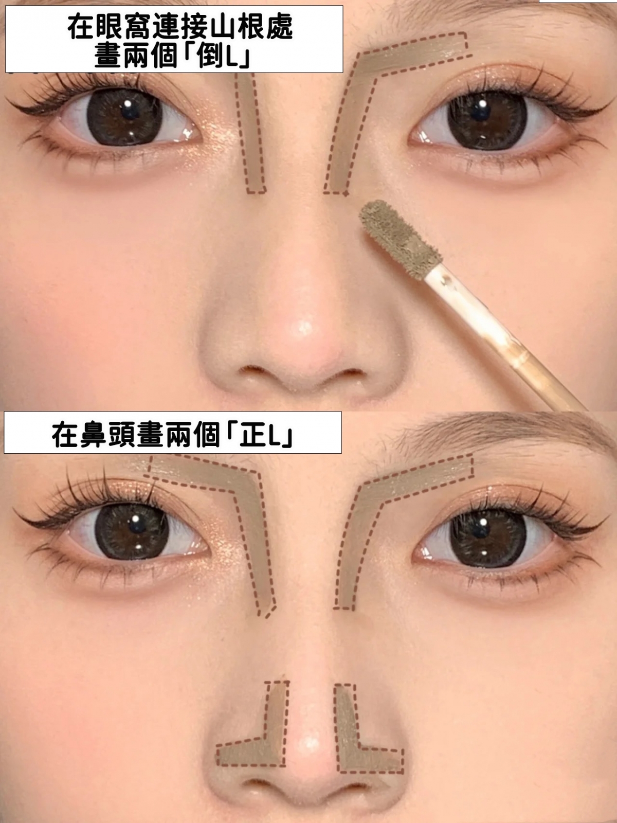 在化好底妝後,先在眼窩連接山根處畫上兩個「倒L」,然後在鼻頭畫上兩個「正L」,其中鼻樑的「L」間隔要比鼻翼的大一些。