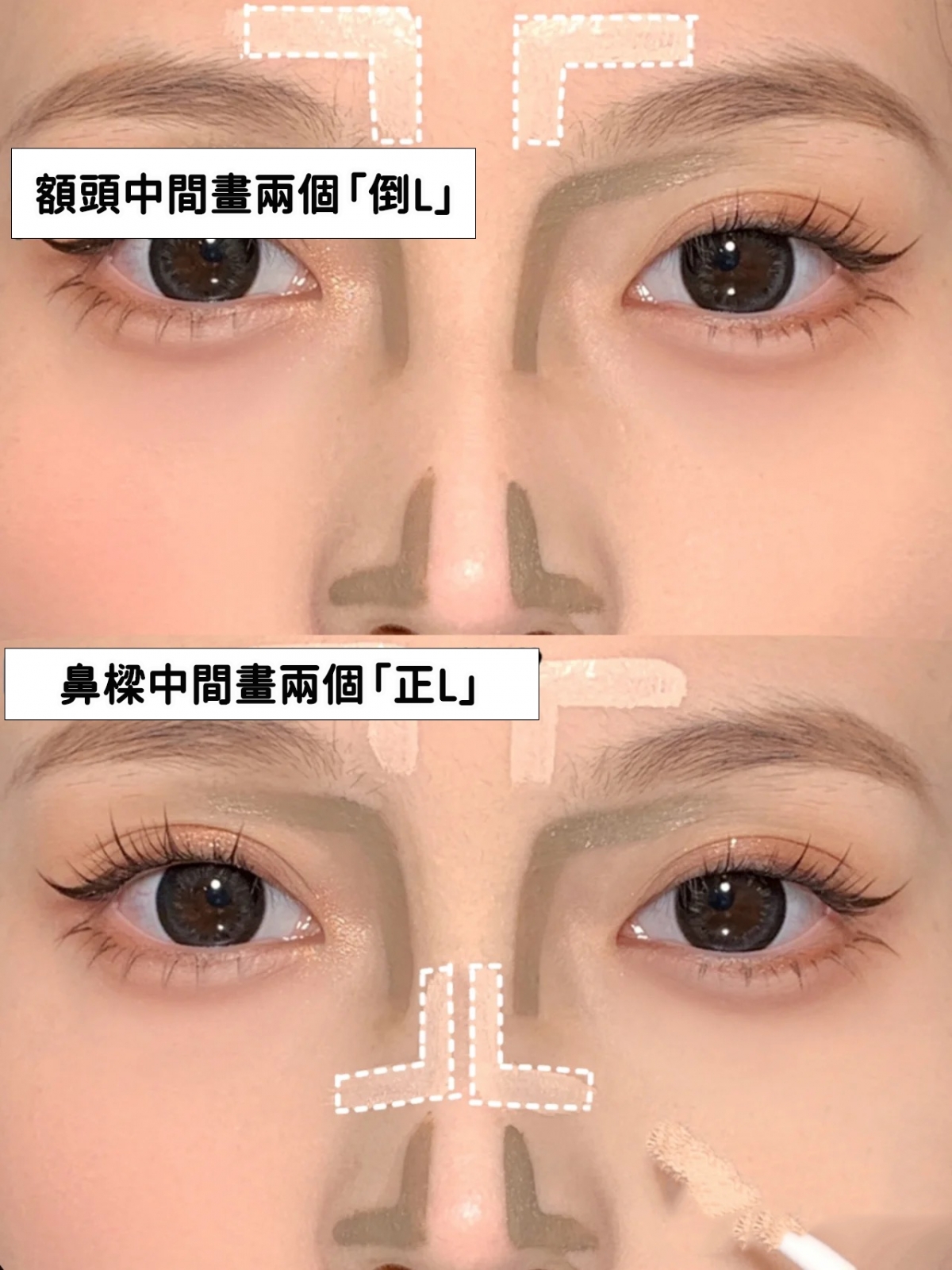 再用提亮色在額頭中間畫上兩個「倒L」,之後在鼻樑正中間再畫上兩個「正L」。