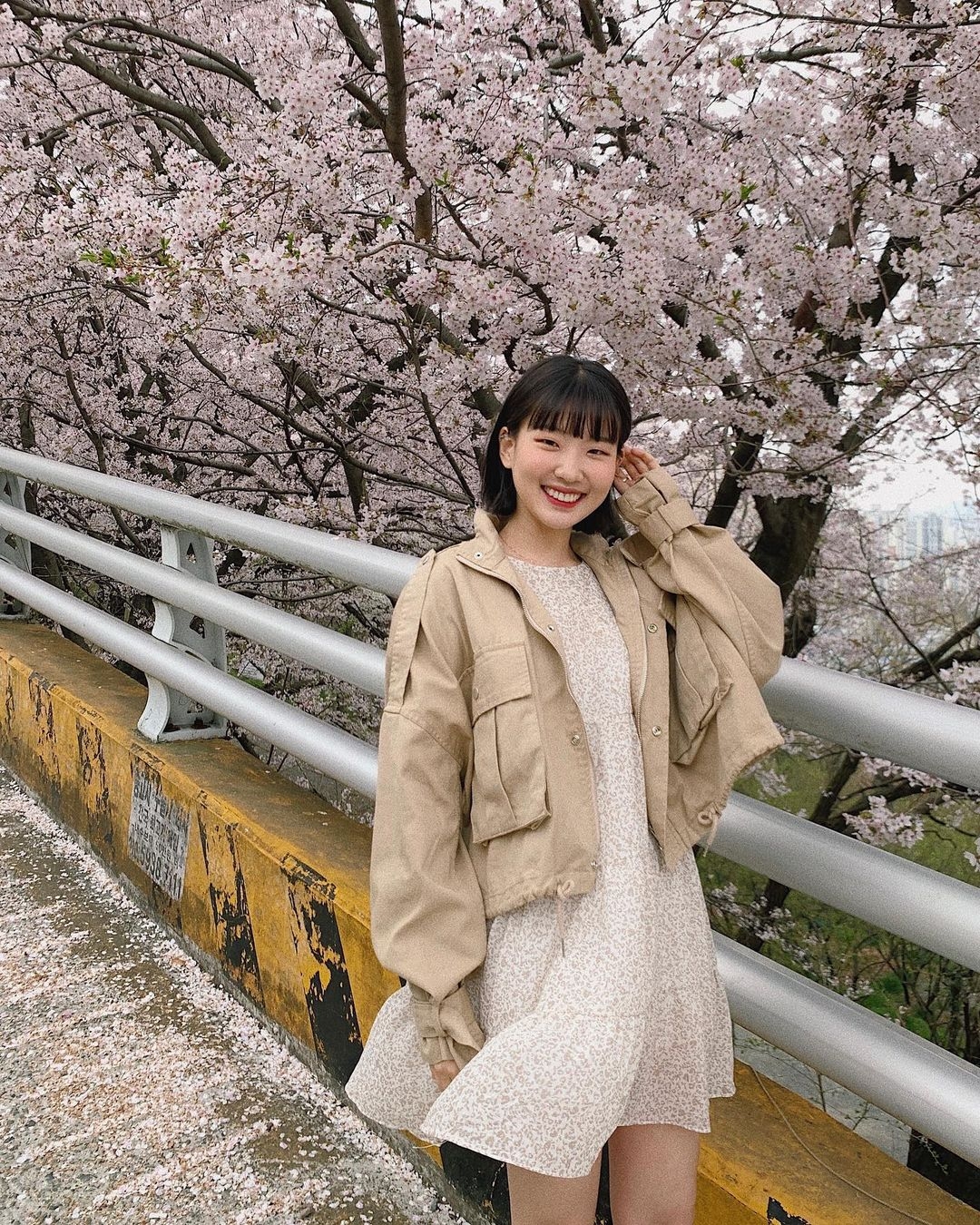 如果不想太刻意,可以試試用大地色調的穿搭去打卡~在粉嫩的櫻花背景中,仍能一眼望到主角,整體風格亦是一致,低調又不失甜美感!而愈淺的大地色,愈有溫暖春日的感覺,像是杏色、淺卡其、淺啡色等,看上去也不突兀。