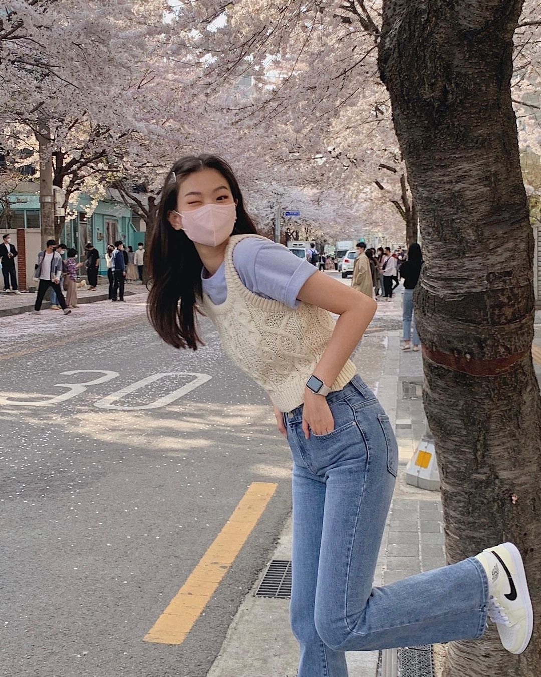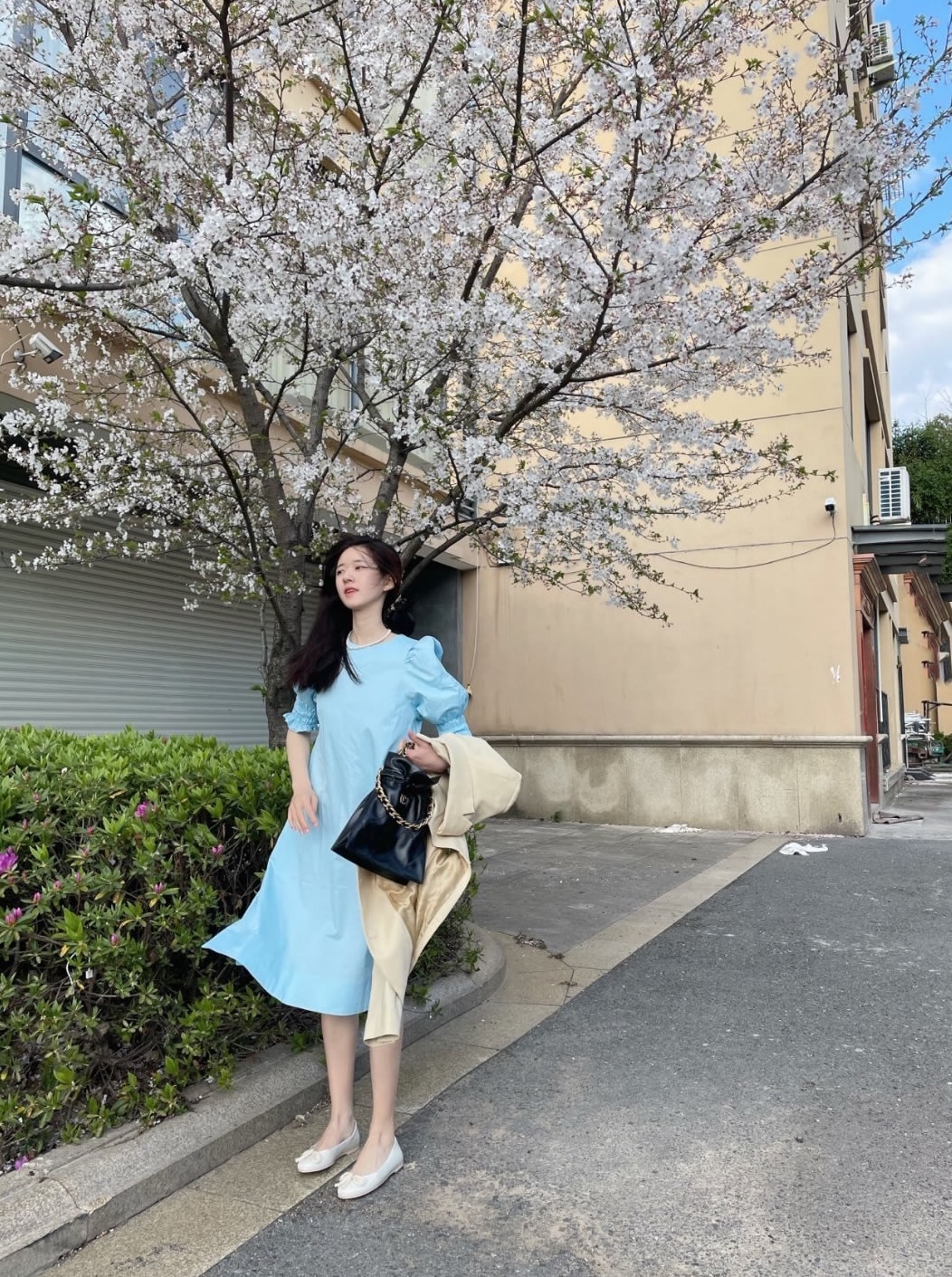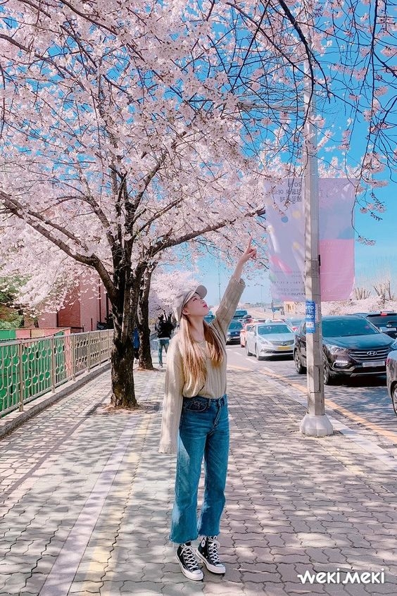 想搶眼一點也可以試試藍色穿搭,還可以隨住櫻花顏色來選擇不同深淺的藍色,小編就比較建議偏淡、偏pastel色調的藍色,看上去會比較和諧~雖然與櫻花營造出強烈的對比,但在藍天白雲和櫻花樹底下,仍然毫無違和感!