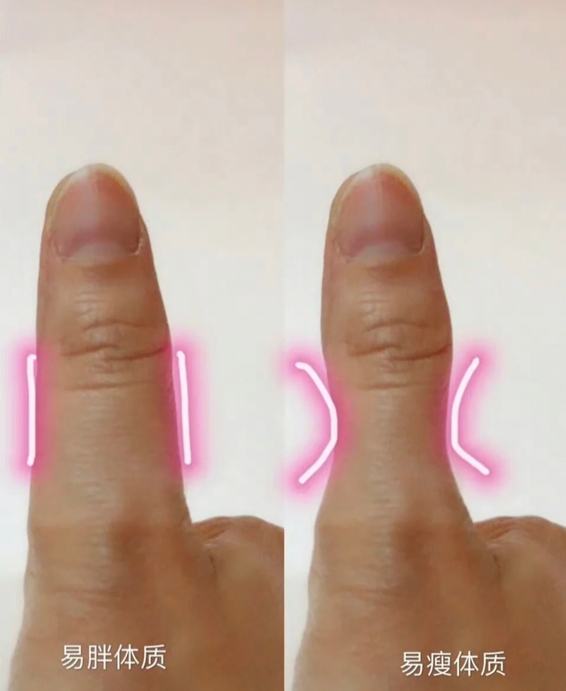 第二個方法是去觀察大拇指的形狀,如果你舉起大拇指的時候,兩側有曲線的話,就屬於易瘦體質。相反如果大拇指呈直線形則是易胖體質,不少網民都發現身邊吃不胖的朋友都是曲線形。