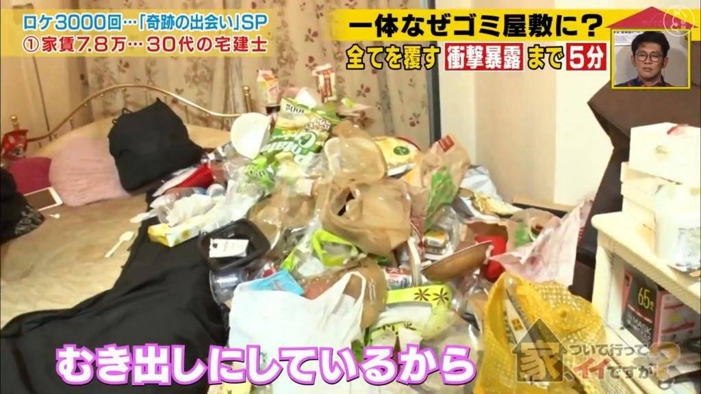 踏進Rika的家後,彷如入了垃圾山,所有空間都放著衣服、雜物和垃圾,完全無位坐,而全屋唯一可以安坐的地方就只有她的床。不僅如此,廚房也放置著大量發臭的食物,還有一堆未洗的碗筷,雪櫃大部分都是過期食物,所以搞到整間屋都瀰漫著異味。
