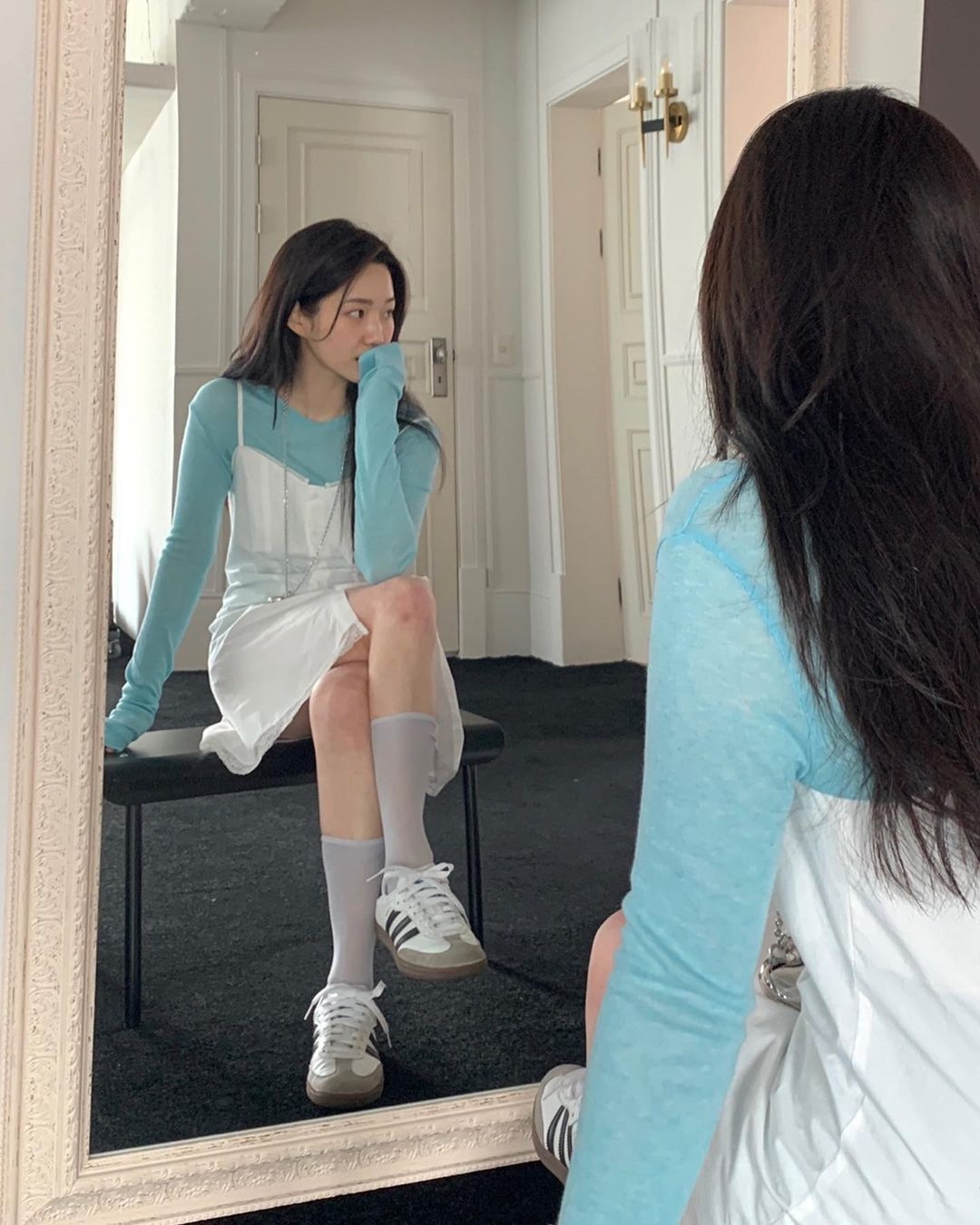 韓妹愛穿單品之一就是長靴,看上去時尚感滿滿,修飾腿型效果更是不錯~再配上一條超百搭的A字短裙或短褲,拉長比例之餘又能展現出大長腿的視覺效果,連屁股和大腿的小肥肉都遮住,充滿青春活力感!韓國的小個子女星IU、Yeri也會這樣搭配!