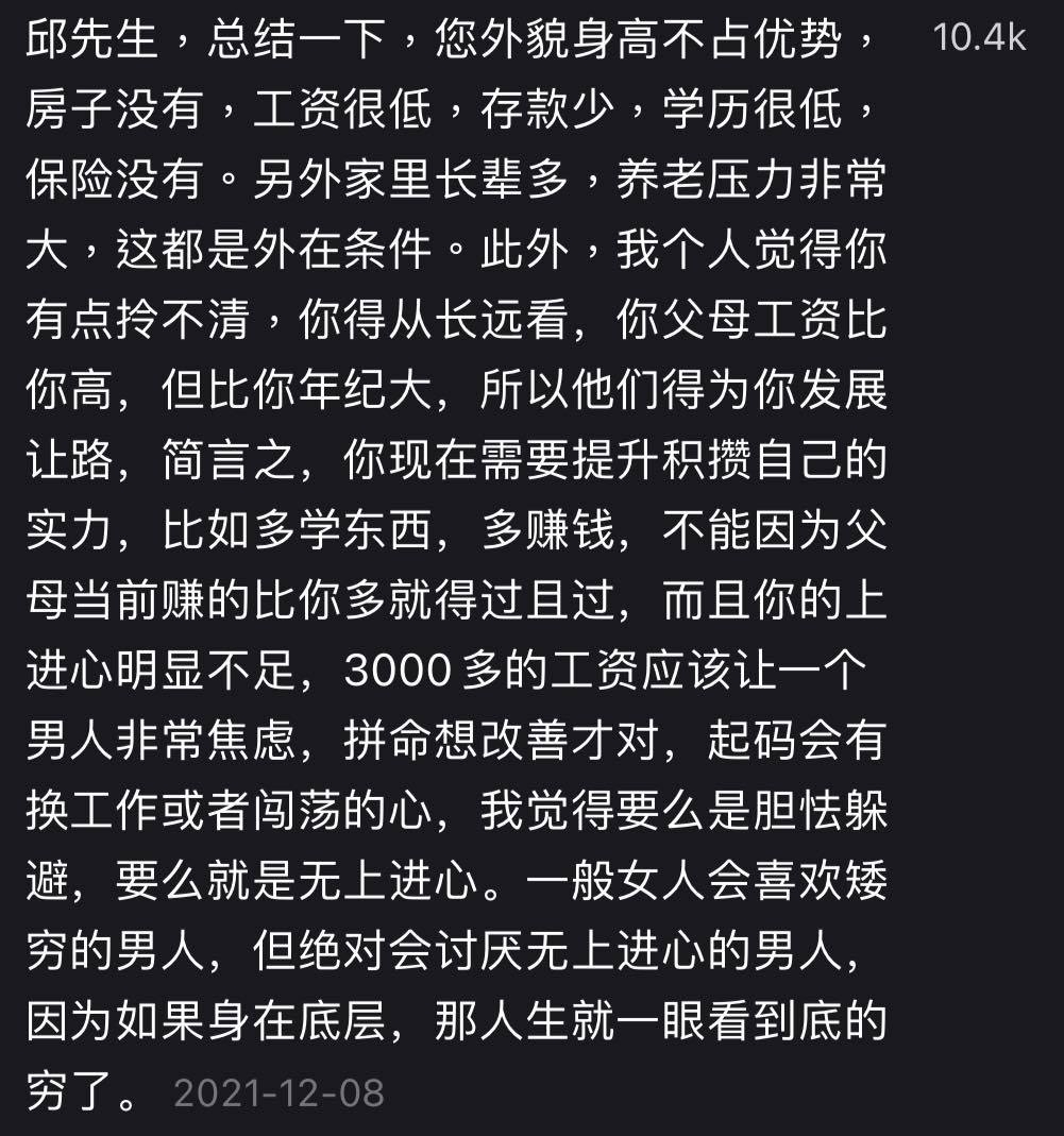 網友還真誠地給出建議,認為一般女人並不會嫌棄外在條件較差的人,但是絕對不能接受無上進心的男人!