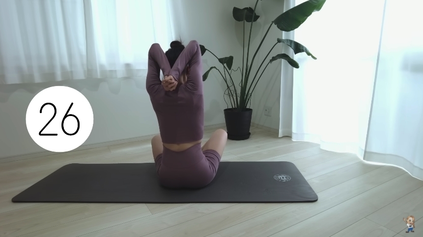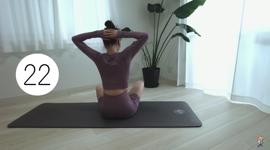 第五個動作是手肘開合,先輕輕用雙手觸耳,然後重覆將手肘打開及收回,記得在過程中要挺直,而且手臂愈打開就可以訓練到背部肌肉。