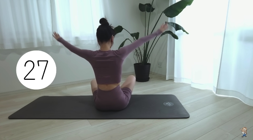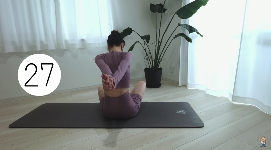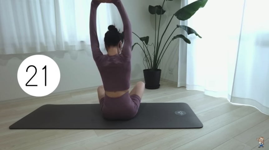 第一個動作先坐在瑜伽墊上,然後舉起雙手往後伸展,要盡量伸直雙手,維持30秒,動作可以刺激到肩胛骨肌肉,有效瘦背及手臂內側贅肉。