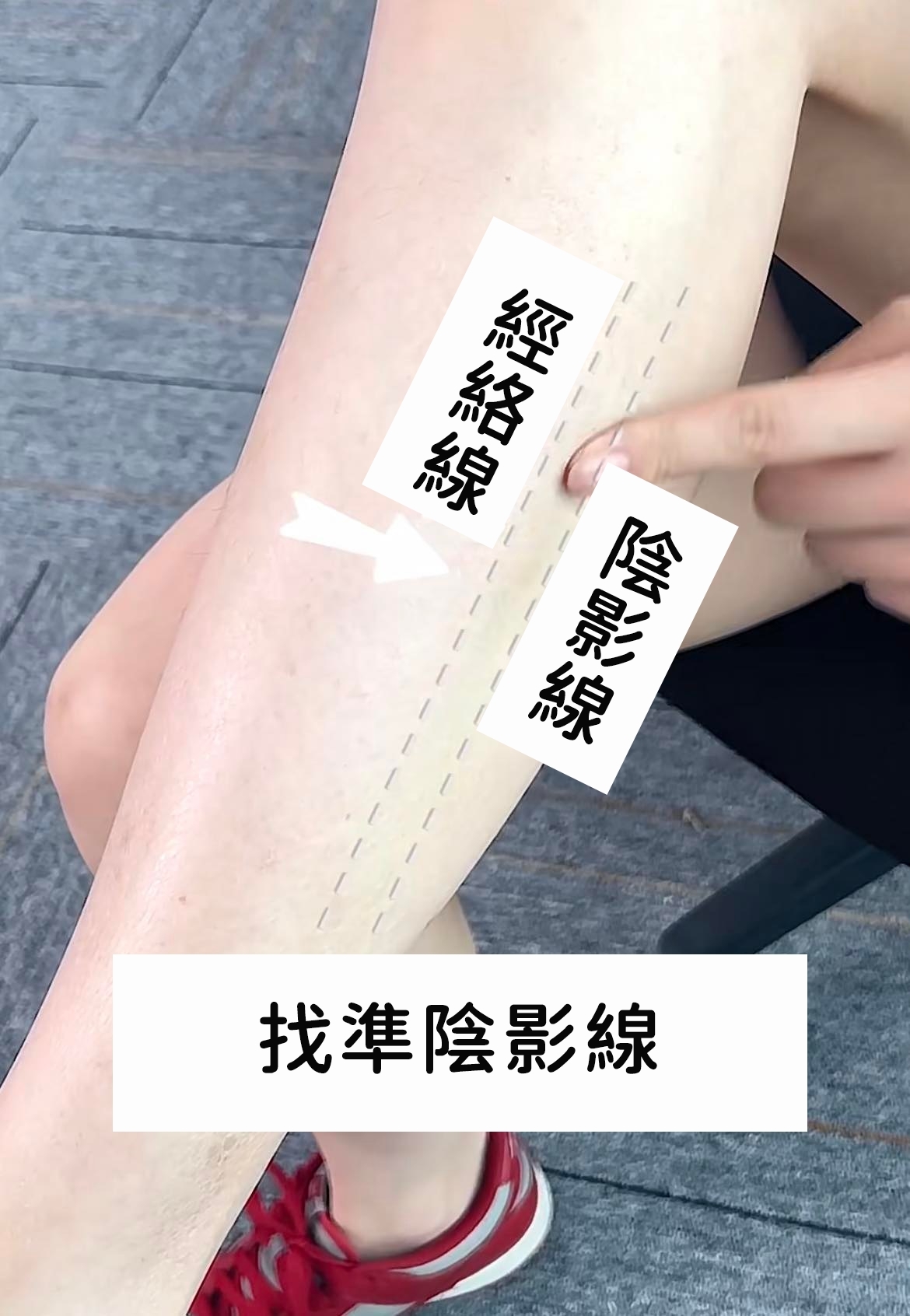 找到小腿肉最厚的地方,然後用大拇指的關節,從膝蓋處一直往小腿到腳踝的方向按壓,按的過程中如果感受到被按壓的地方有酸脹感,就代表按壓的位置是正確。