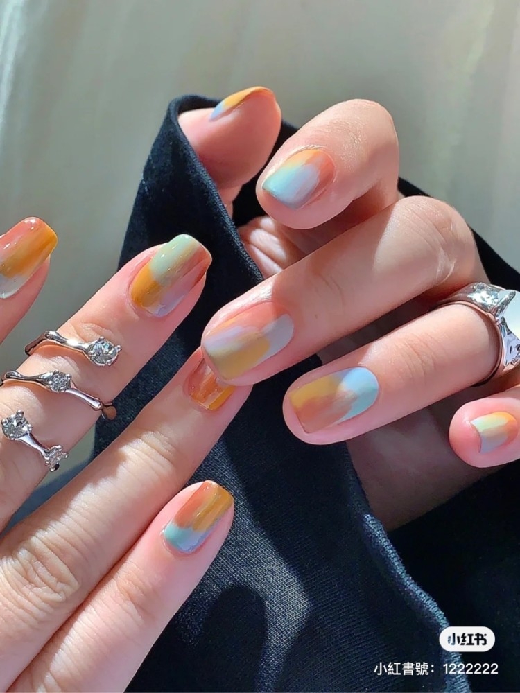 說到春夏又怎能沒有馬卡龍色調呢~把各種粉嫩、夢幻的馬卡龍色都放在指尖上,再慢慢暈染,色彩繽紛之餘,給人一種充滿活力的感覺!