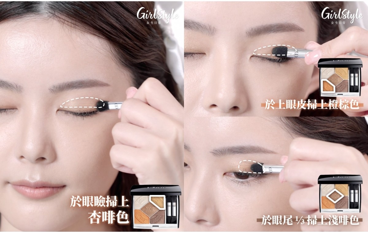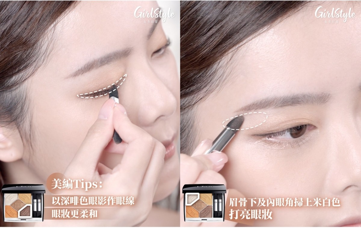 眼妝再用全新推出的 Dior珍藏版高級訂製五色眼影 #533 Rivage,輕輕地勾畫眼部輪廓,打造清爽輕透眼妝為主,低調又百搭!首先於眼瞼掃上杏啡色為打底色,再於上眼皮掃上橙棕色作為眼妝主色,眼尾1⁄3位置則掃上淺啡色,打造出層次感!