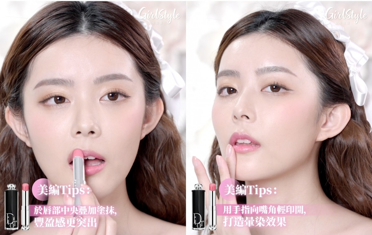 而唇色就揀選自然的裸色調,使用鏡光誘惑唇膏的#373 Rose Celestial,於唇部中央疊加塗抹,再用手指向嘴角輕印開,呈現出韓系暈染效果,不但有水潤豐盈櫻唇效果,還可以展現出自然好氣息~