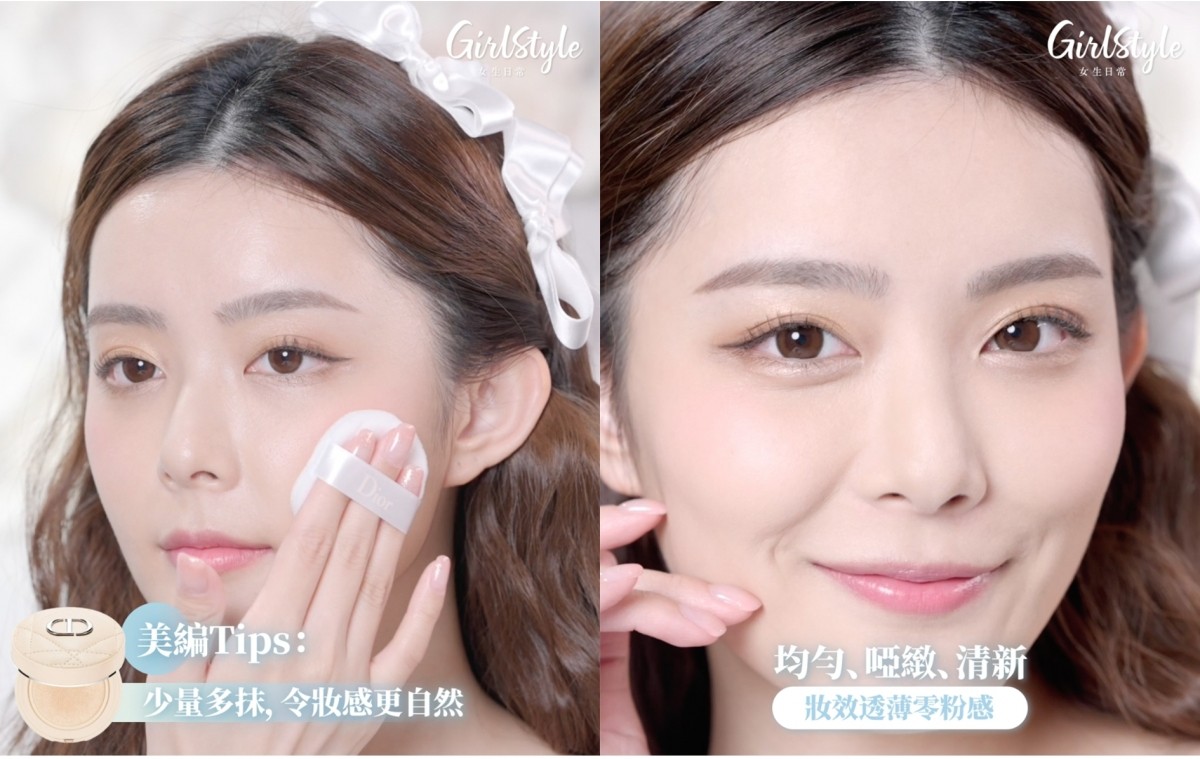 最後用恆久貼肌氣墊蜜粉定妝,於面頰上均勻地印開,以控油蜜粉打造均勻、啞緻、自然清新的底妝。