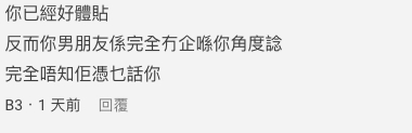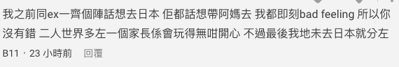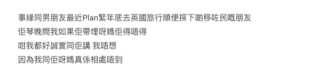 她指男友要求帶上自己母親一起去:「佢就同我講,佢好想帶呀媽周圍去。因為佢呀媽邊到都冇去過。」但是女網友知道自己跟男友母親無法相處,因此還是拒絕了。不過女網友也很體貼地提議男友,今年先跟母親去旅行,反正他們還年輕,以後還能二人旅行。結果卻被男友說她不懂體諒。