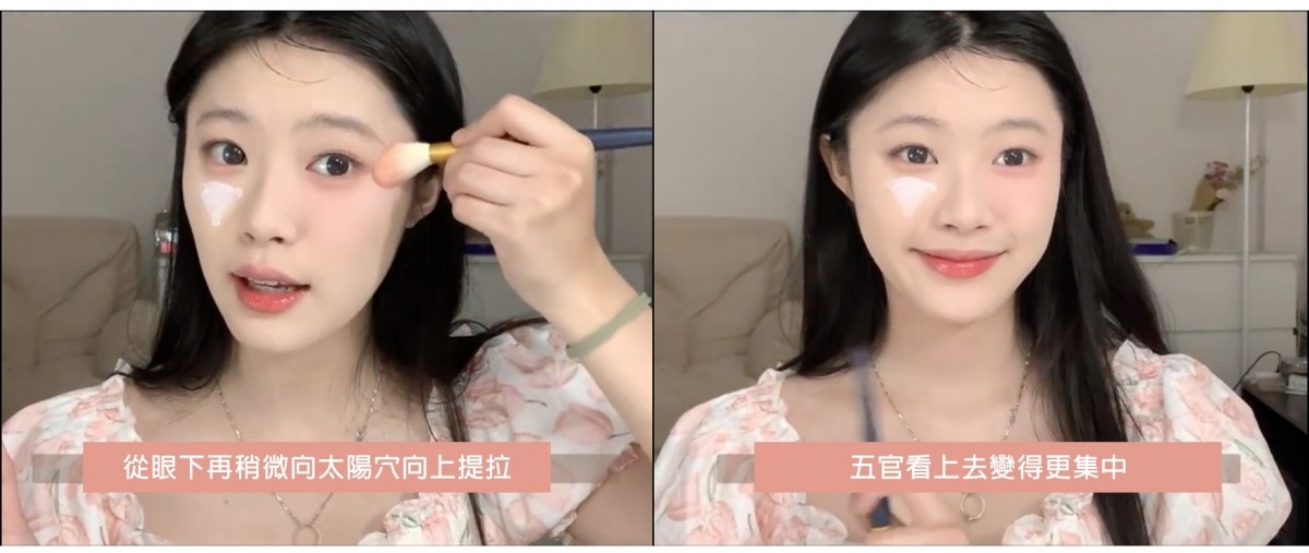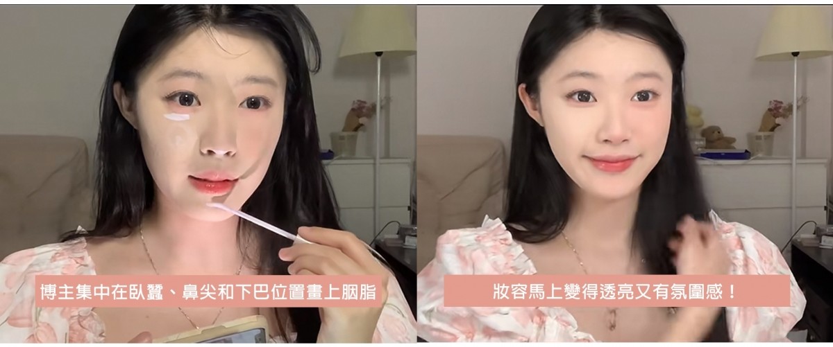 最後博主小黃泡泡 更分享了一個畫胭脂小心機,就是把胭脂當成陰影畫~先將電筒放在臉下往上照,再對比一下臉上打開電筒的前後變化,看看哪些位置的顏色有所變化,像她就集中在臥蠶、鼻尖和下巴位置畫上胭脂,妝容馬上變得透亮又有氛圍感!