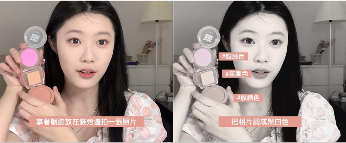 2.如果胭脂顏色比臉的明度較為光亮便屬於膨脹色;與臉上的顏色接近的話就是氛圍色;比臉的膚色更暗沉的便是收縮色。