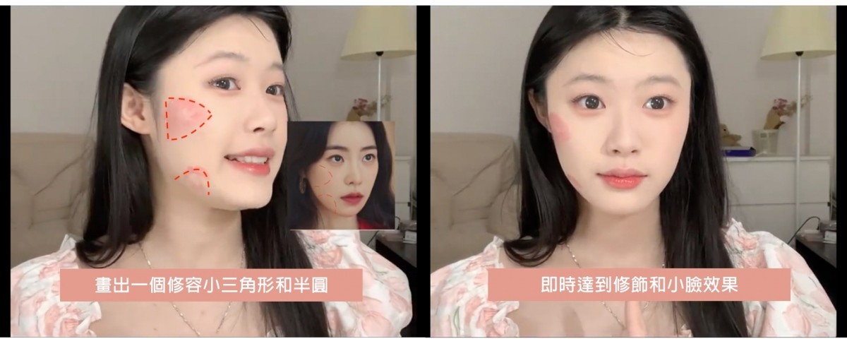 先側臉找出顴骨的最高點,往太陽穴向上提拉、顴骨平拉和向下拉,暈染邊界便會形成一個修容小三角形,再於咀嚼肌位畫上一個半圓,再把胭脂暈染開,能把下顎角修細一點,即時達到修飾和小臉效果,十分顯臉瘦!視覺上連五官亦放大了!像大熱韓劇《黑暗榮耀》的朴涎鎮也是用這個方法畫胭脂~