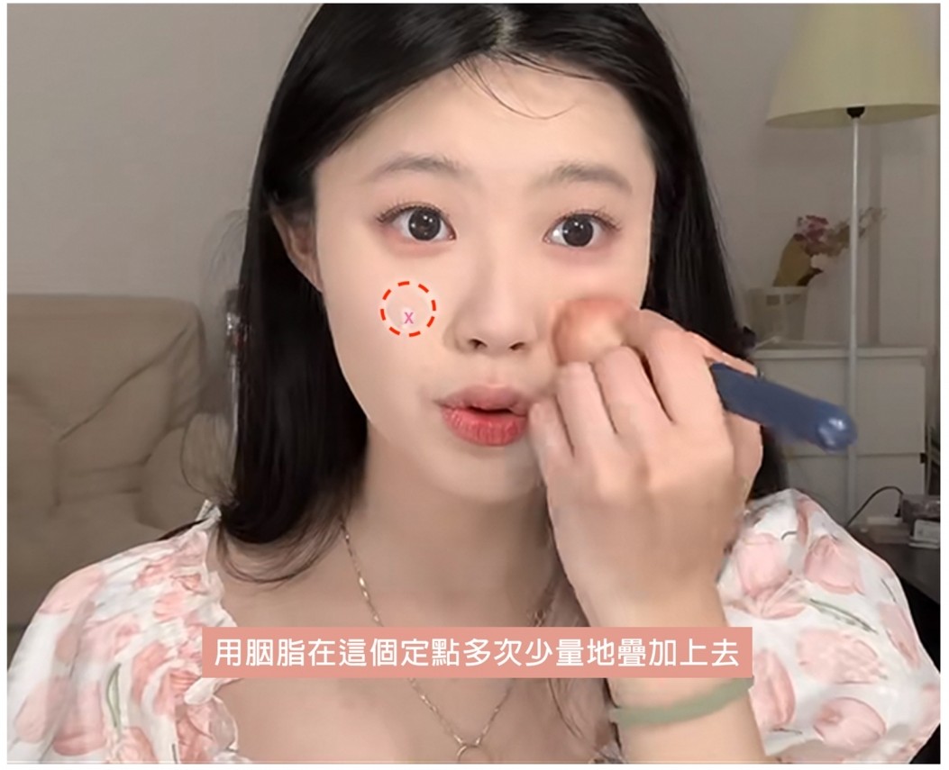 氛圍色胭脂基本上是沒有太多限制,適用於任何臉型和妝感~最簡單可以先找出眼珠下方和鼻翼的交疊位為定點,再用胭脂在這個點多次少量地疊加上去,馬上打造出可愛又減齡的感覺~