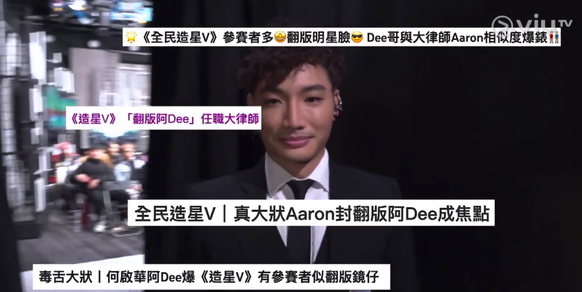 《全民造星V》近日播出的最新集數中,翻版Dee哥梁浩朗(Aaron)終於出場。Aaron是一名律師,擅長辯論、演講,在面試的時候就已經很喜歡長篇大論與評審辯論,令評審也忍不住勸告他:「俾多啲真誠,收起小聰明」