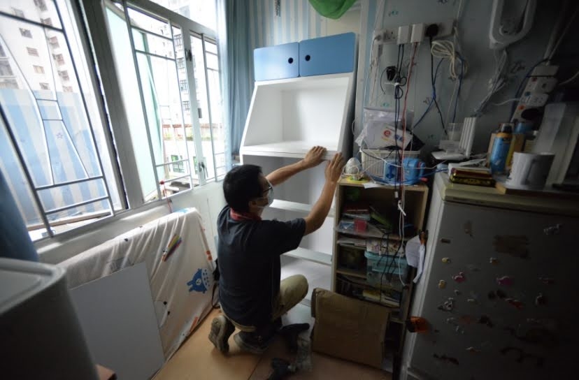 社企以環保回收出發,亦參與扶貧工作!根據2021年人口普查,全港約有10.4萬間劏房,容納21.4萬住戶,他們居住環境狹窄,市面很難找到尺寸適合的傢俬,更負擔不起昂貴的訂造品,因此Oliver團隊便申請資助,為這些基層劏房戶免費提供傢俬。