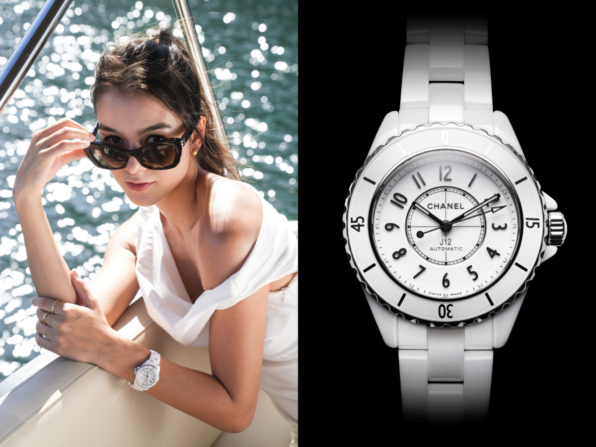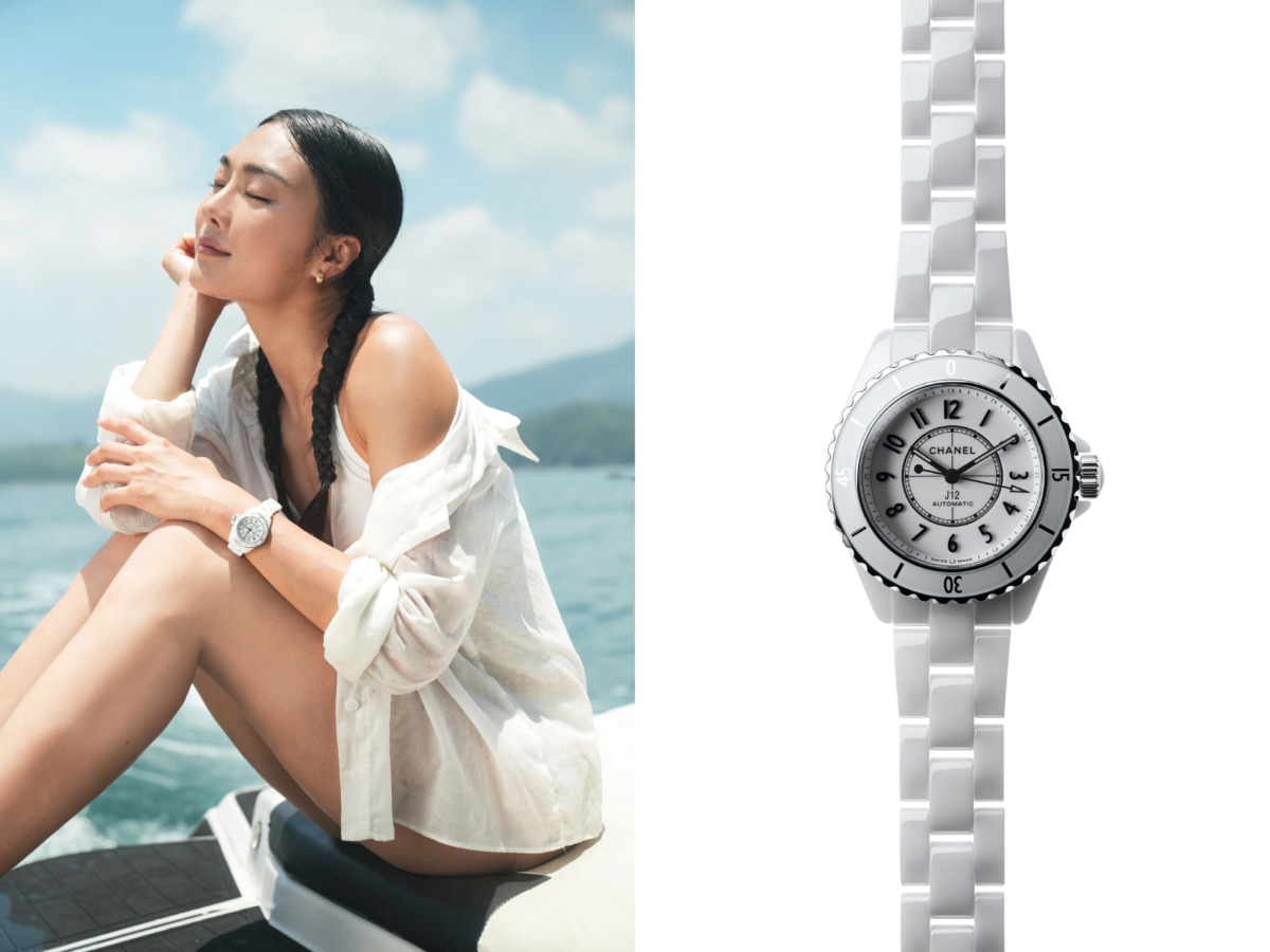 Cecilia 以一身白色造型搭配純白色 J12 Calibre 12.2 33mm 腕錶,光亮陶瓷質感令 J12 成為造型的亮點,使同色系穿搭不再乏味!J12 以高科技陶瓷打造錶身及鏈節錶帶,高度抗耐性,不易刮花或變質,加上一上手觸感更有一點點冰涼~在炎炎夏日裡,絕對是驚喜賣點呢~