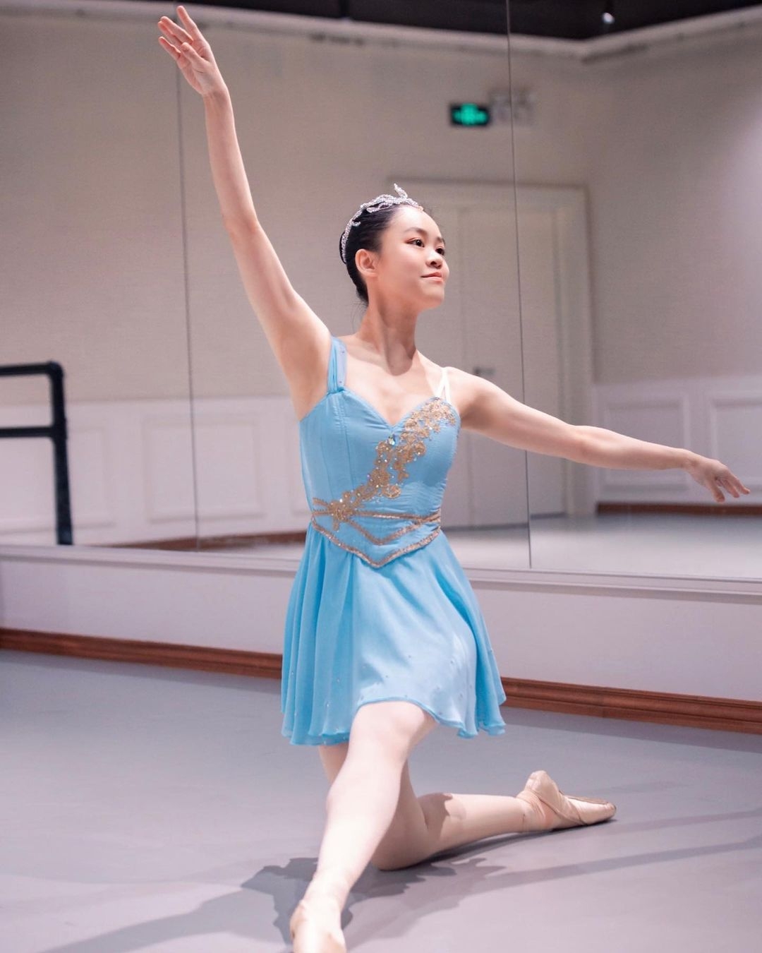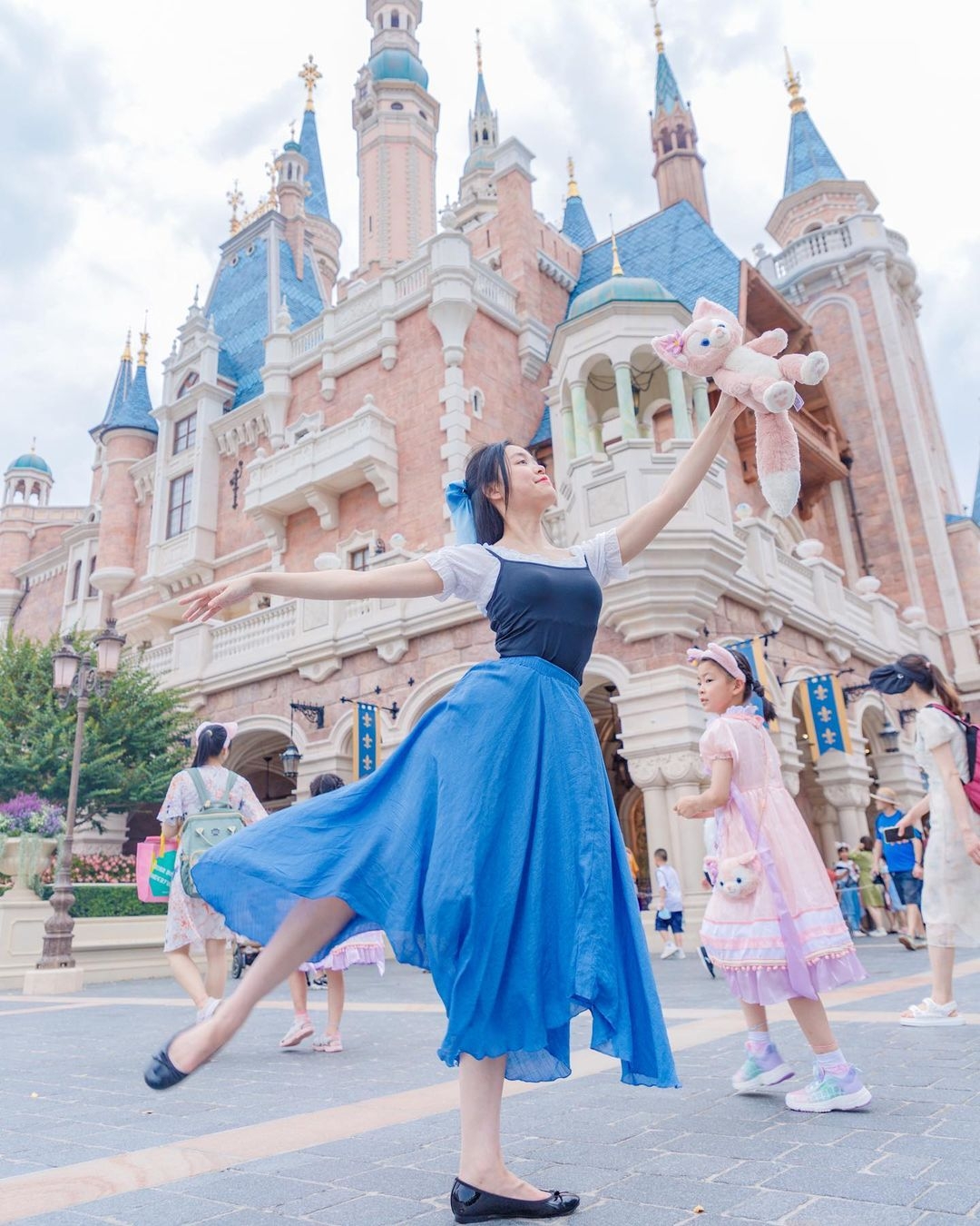 劉秀盈(Zoe)一向都很有藝術天分,能歌善舞,在2021年更入選香港芭蕾舞劇團,又曾在芭蕾舞比賽中勇奪金獎,表現出她多才多藝的一面。近日她身穿一套可愛公主系長裙到上海迪士尼打卡,上衣是白色泡泡袖配搭黑色吊帶背心,而下身則是海藍色雪紡長裙,其後更在樂園內不同角落大擺Pose影相,其中還在城堡前擺出芭蕾舞的姿勢打卡,非常有氣質。