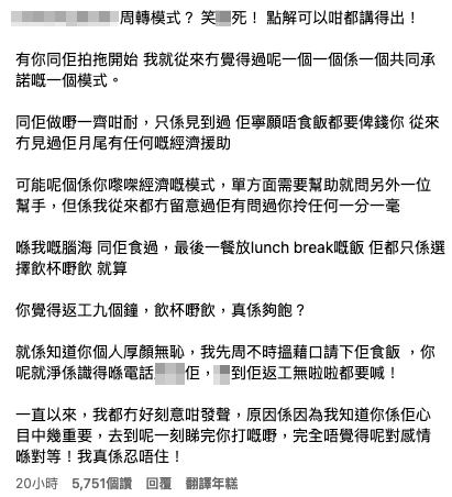 疑似Jessie的前同事又提到與Jessie吃飯時對方為了節省金錢只喝一杯飲品「你覺得返工九個鐘,飲杯嘢飲,真係夠飽?就係知道你個人厚顏無恥,我先周不時搵藉口請佢食飯,你呢就淨係識得喺電話XX佢,X到佢返工無啦啦都要喊!一直以來,我都冇好刻意咁發聲,原因係因為我知道你係佢心目中幾重要,去到呢一刻睇完你打嘅嘢,完全唔覺得呢對感情係對等!我真係忍唔住!」